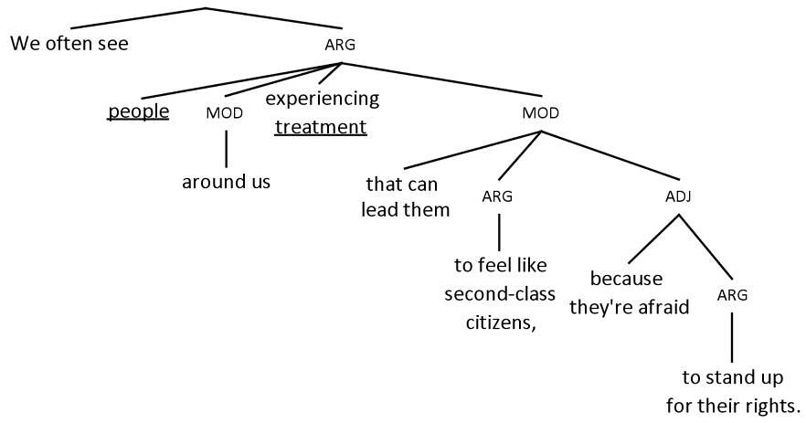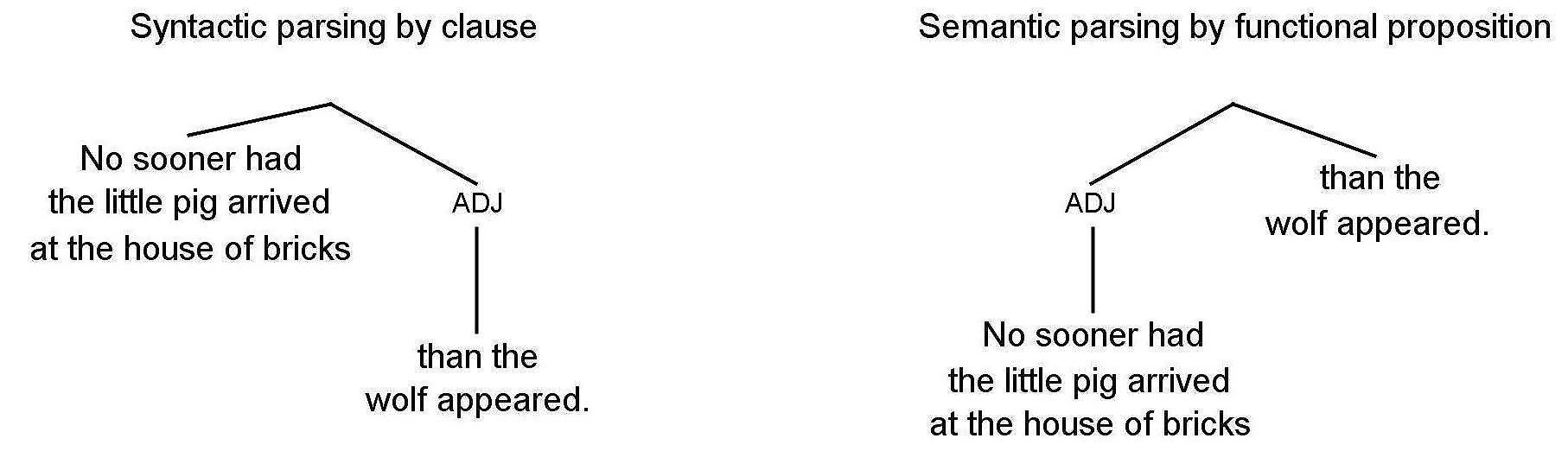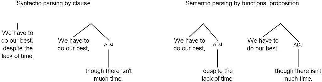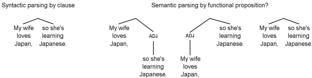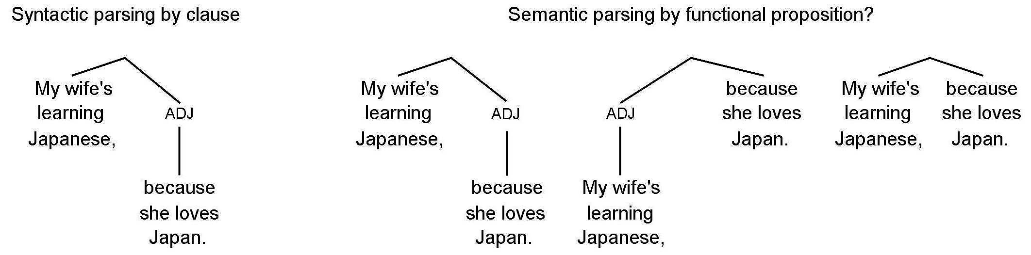 We’ve seen how a semantic parse tree, similar to a syntactic parse tree in the tradition of generative grammar, can be used to illustrate the propositional structure of a complex sentence. Here’s more detail on how the parse trees in this study are laid out: Though segmented semantically, propositions are displayed as leaves on the trees in their surface syntactic forms. Some features recorded for our statistical analysis involve the linear order of propositions in a complex sentence. So the parse trees are spread out horizontally to show both the linear order of propositions and the hierarchical relations between them.