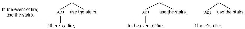 Syntactically contiguous parts of a proposition are shown together on the same leaf of a tree. A functionally independent proposition – one which makes an assertion – is shown at the top level of the tree. A functionally subordinate proposition, including one which is part of a parent proposition, is shown at a lower level. Parts of a proposition which are syntactically split by another proposition are shown on separate leaves, at the same level and under the same node. An overt coordinating link between propositions is included on the same leaf as one of the linked propositions. An overt subordinating link is included on the same leaf as the subordinate proposition.