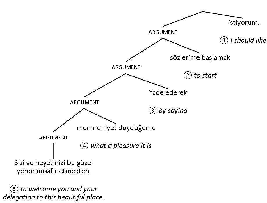 For example, figure 43 shows a parse tree with a hypothetical opening sentence from a Turkish speech. The numbers show the order the branches need to be read in to make sense in English.
