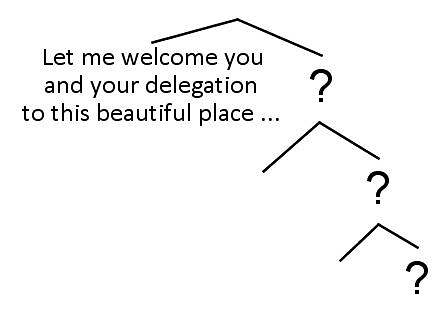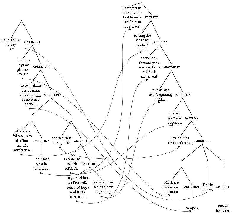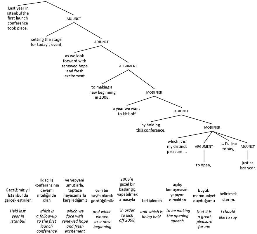 To see how this can work, let’s look at an example of a complex sentence for interpretation. Figure 45 shows a parse tree with the beginning of a speech given in Turkish by the Vice President of the Scientific and Technological Research Council of Turkey, at a conference in 2008. The numbers show the order the branches need to be read in to make sense in English.