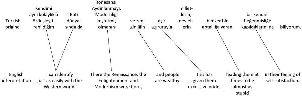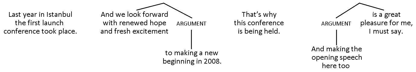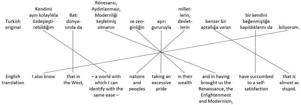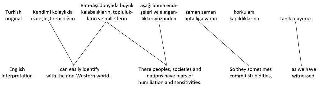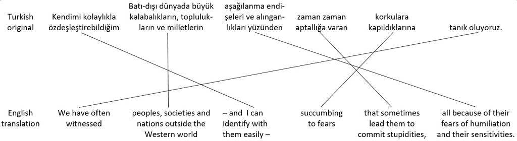 Compared to the original Turkish sentences, the order of propositions in the English translations is completely jumbled. Unless an interpreter had a written copy of the speech to prepare beforehand, it’s unlikely that they could produce an interpretation anything like the nice written translation in real time, with the main propositions – which come at the end of the Turkish sentences – in the right places at the beginning of the English sentences, and with all the other pieces in the right places too. Instead, the interpreter might try dividing the original Turkish sentences shown in figure 41 into shorter ones. With luck, they might produce something like the hypothetical English interpretation of the two sentences shown in figure 42.