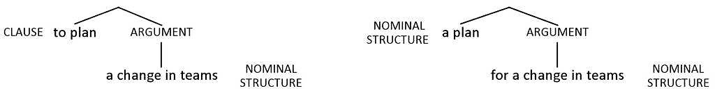 In the parse tree in figure 4, the propositions in the bottom row function as arguments of the underlying verbs “plan” and “propose,” from which the nominal predicates in the second row are derived. “Plans” and “proposals” are treated here as process nominals – that is, predicates with argument structure. In contrast, “composition” in the second proposition in the bottom row is treated as a result nominal with no argument structure – just as if it said “names” or “numbers” instead of “composition.” The distinction between result nominals and process nominals is sometimes fuzzy. This distinction is discussed in the detailed presentation of the semantic parsing method, in section 1.7 of Annex I.