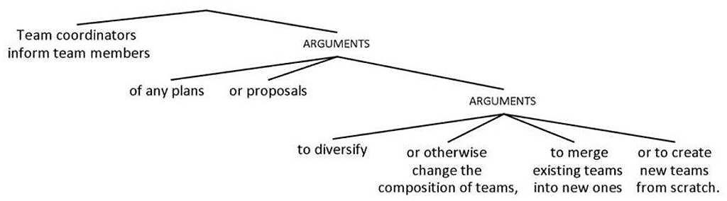 Figure 4 shows a parse tree of the hierarchical relations between propositions in a complex sentence. The labels on the nodes indicate the semantic role of each subordinate proposition in relation to its parent. In this sentence, each subordinate proposition is a semantic argument of its parent.
