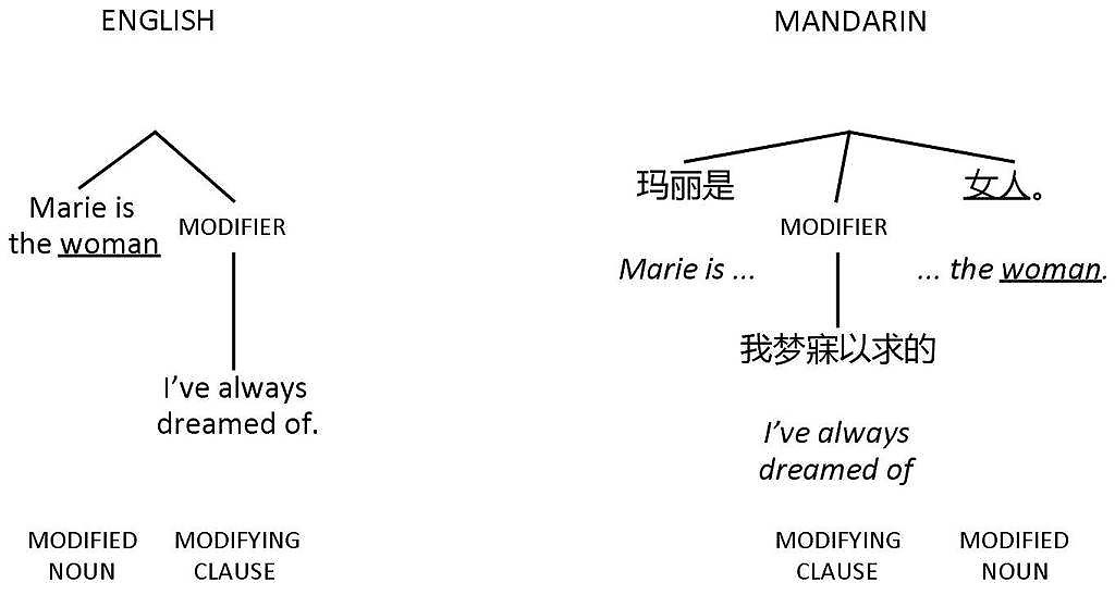 The English structure in figure 5 is right-branching, with the modifying clause coming after the modified noun in the parent clause. In the Mandarin version, the modifying clause syntactically splits the parent clause, coming before the modified noun, in a left-branching structure.