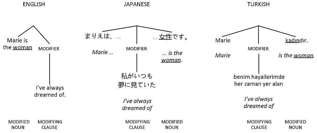 Some languages are even more structurally different from English than Mandarin. In a language like Japanese, Korean or Turkish, complex sentence structure is consistently left-branching. So a relative clause in one of those languages typically goes before the noun it modifies in the parent clause, as illustrated in figure 7.