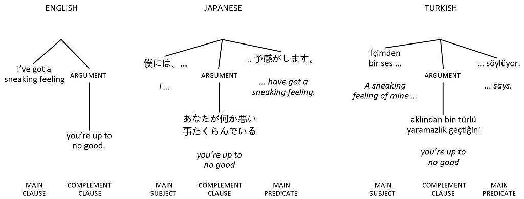 A complement clause in a language like Japanese, Korean or Turkish typically goes before the predicate in the parent clause, often syntactically splitting that clause, as illustrated in figure 8.