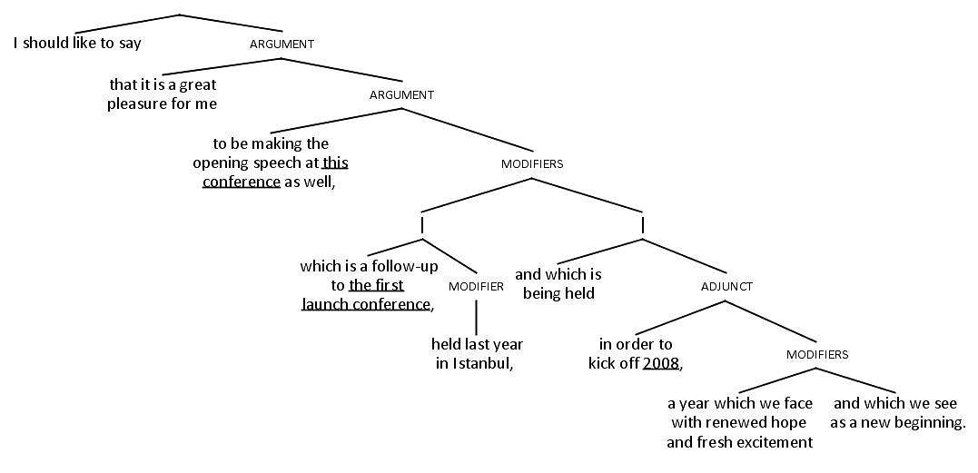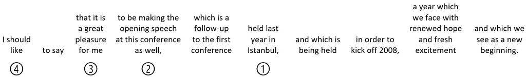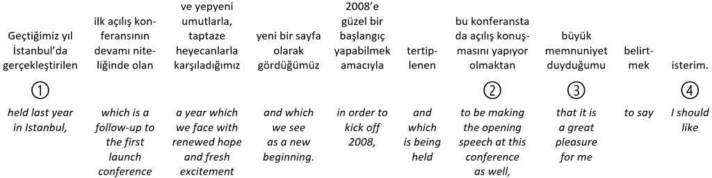 In the original Turkish version of the sentence, the description “held last year in Istanbul” comes before “to be making the opening speech at this conference as well.” So the linear sequence of event descriptions in the original Turkish version reflects the chronological order of the events described. Likewise, “to be making the opening speech at this conference as well” comes before “that it is a great pleasure for me,” which comes before “I should like to say.” Here again, linear sequence reflects chronological order. First the speaker got the chance to speak, that made him happy, and now he’s telling us about it.