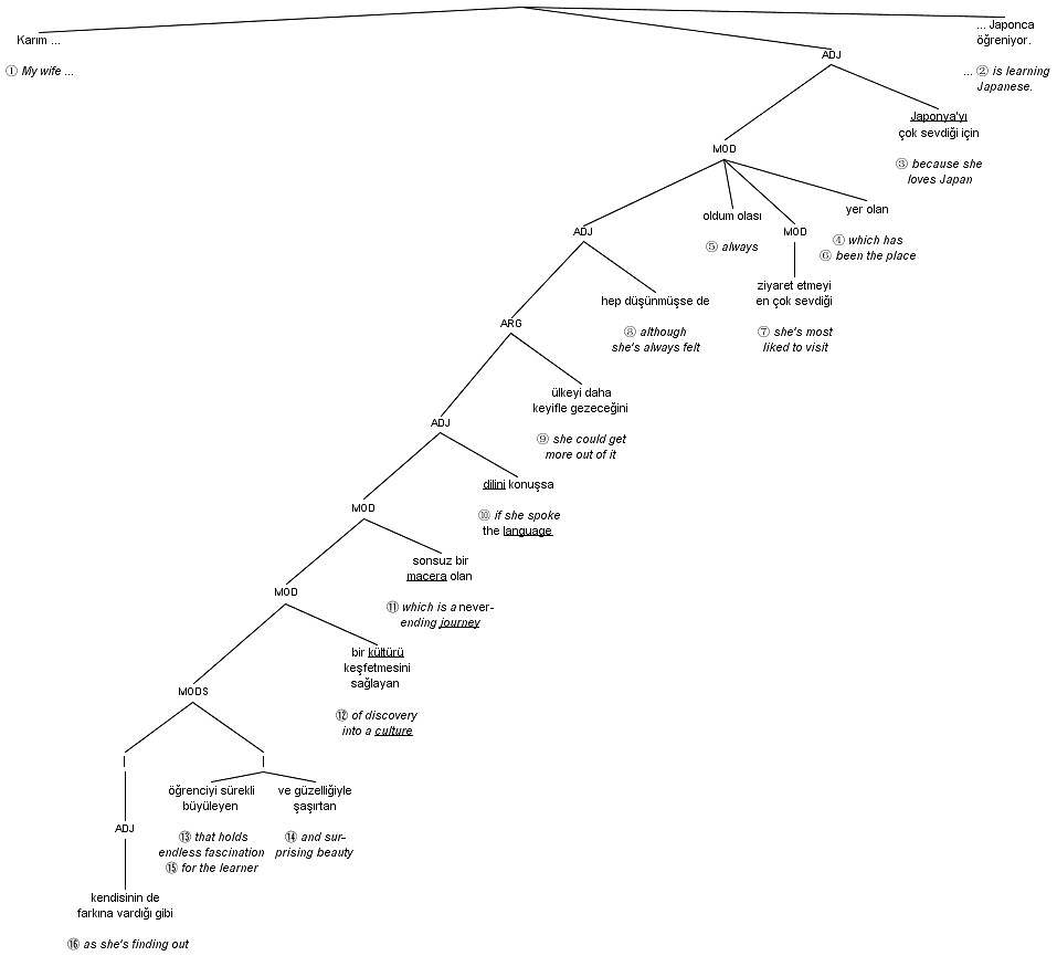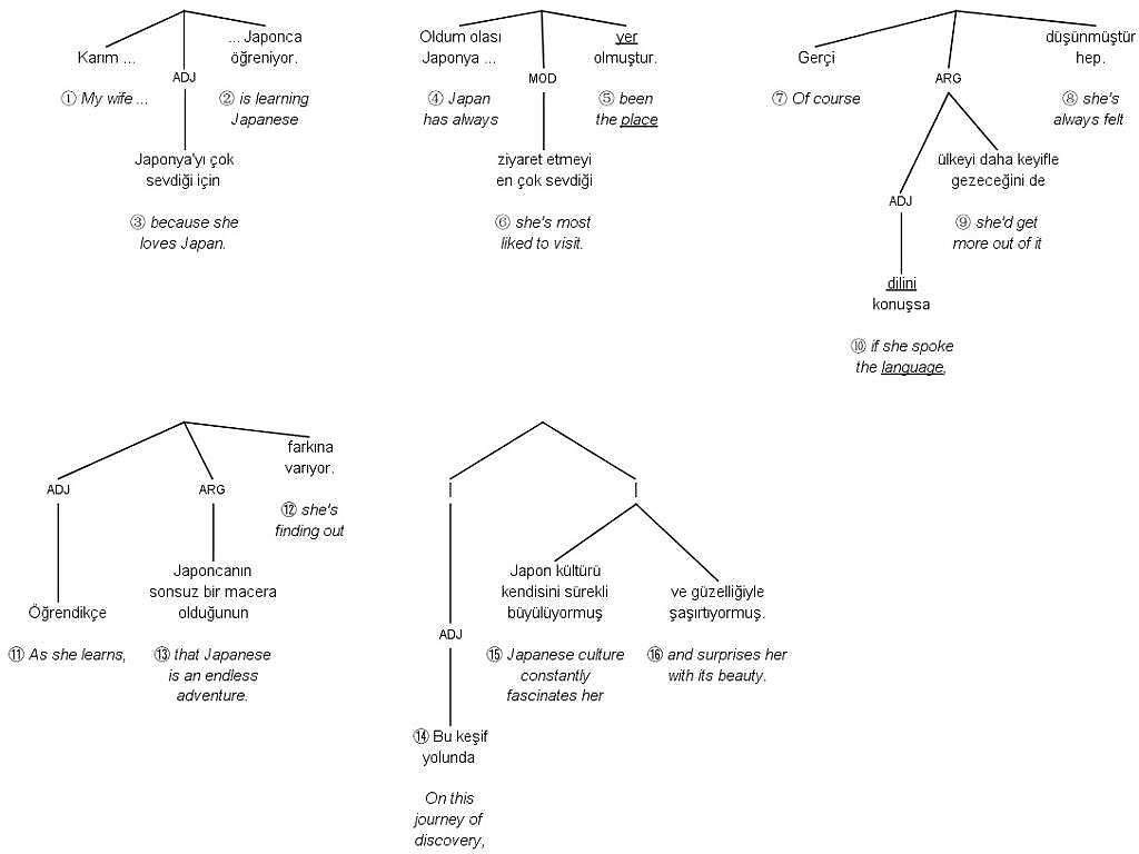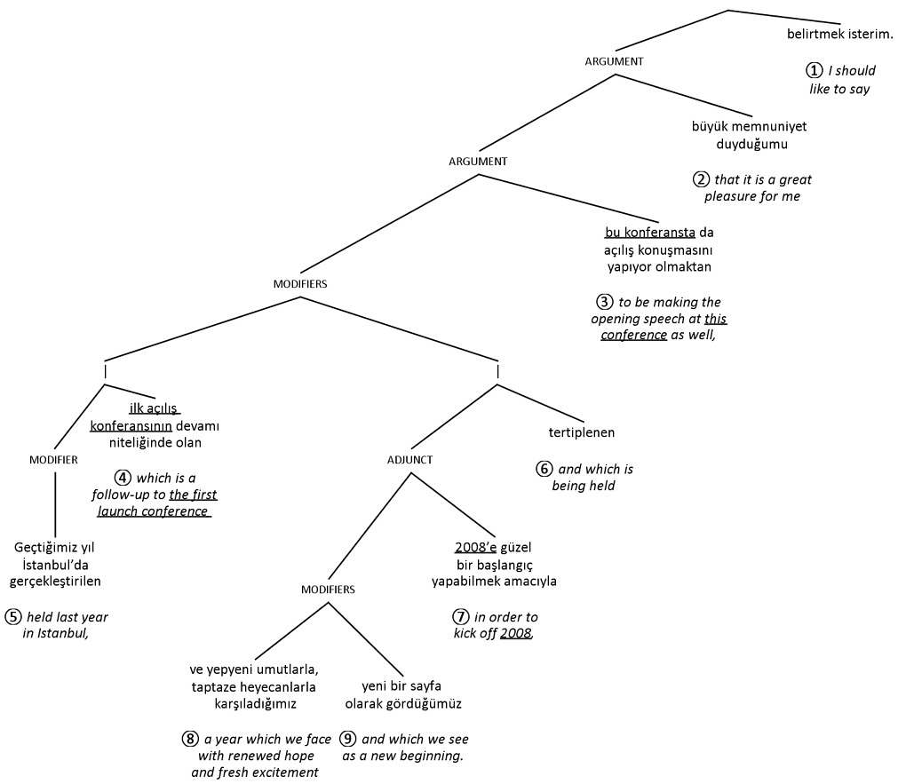 In a good translation based on a semantic analysis of structure, a complex sentence with multiple assertions in a European language can be rendered in a language like Turkish as a series of shorter sentences. Each of those shorter sentences can contain one functionally independent proposition corresponding to the main clause, and one or two other functionally independent propositions corresponding to subordinate clauses. An example, produced by expert translator and interpreter Aksel Vannus, is shown in figure 55. The numbers show the order the branches need to be read in to make sense in English.
