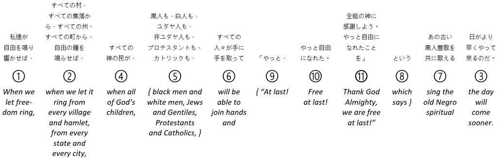 A nice Japanese translation of Dr. King’s famous speech is published on the website MLK online. That translation, shown in figure 60, reflects the trade-off described above. Some structural accuracy is sacrificed, in exchange for greater ease of understanding, clearer logical order and more powerful rhetorical effect. This time the numbers indicate the order the phrases need to be read in to make sense in English.