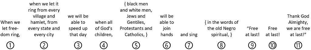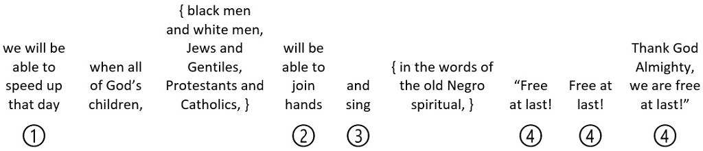 In the previous section, we saw how translating or interpreting a complex sentence based on a syntactic analysis of structure can disrupt the logical order in which information is presented. Another way a syntactic analysis can disrupt the flow of a text or speech is by weakening its rhetorical effect. To see how, consider the last sentence of Dr. Martin Luther King’s historic 1963 speech, “Freedom’s Ring,” known for its refrain‑like line, “I have a dream.” The sentence is shown in figure 56, grouped into functional propositions.