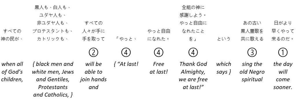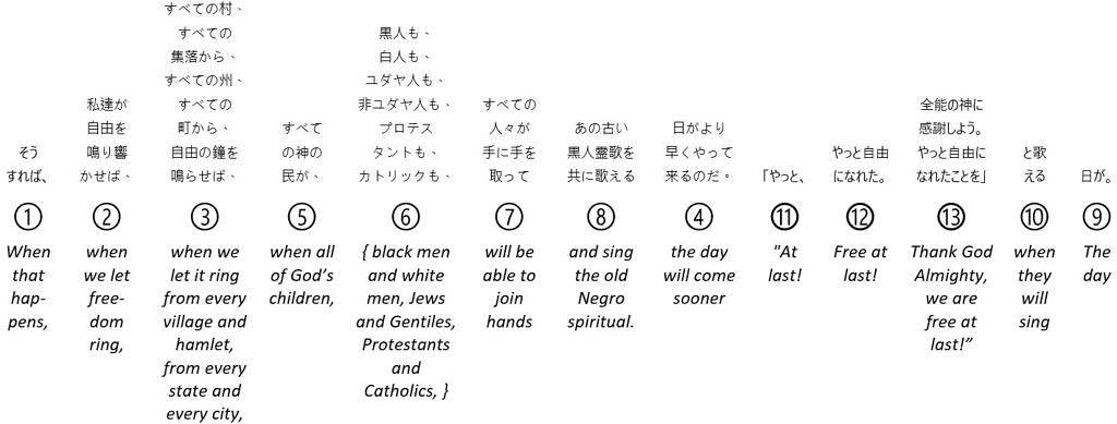 But logical order isn’t the only problem. Another problem with the hypothetical, structurally accurate Japanese translation in figure 57 is the rhetorical effect of the order the events are described in. The original English version of the speech crescendos to the final words, “Free at last!” Those words are powerful for several reasons: the use of direct speech; their elliptical syntax; their repetition; their religious invocation; the sonorous way they’re declaimed; and the fact that they’re at the end of the speech, reverberating among the cheers of hundreds of thousands of people present at the event, and in the heads of listeners everywhere then and since. But this rhetorical effect may be diminished in the hypothetical, structurally accurate Japanese translation. Because complex sentence structure is head-final in Japanese, the structurally accurate Japanese translation places the inspiring words of the spiritual in the lowest level of a multiple nesting, followed by the last part of a syntactically split proposition, which is followed by a time description (“the day will come sooner”).