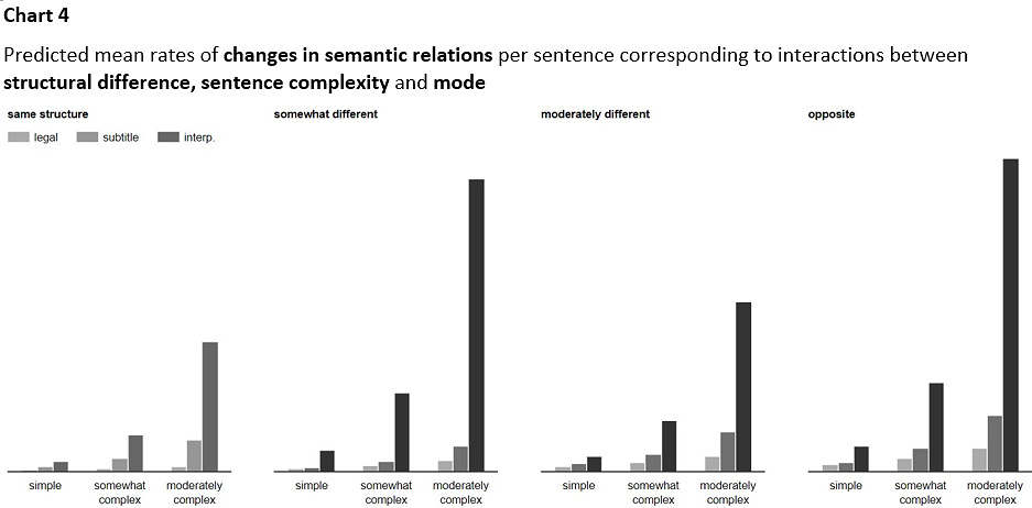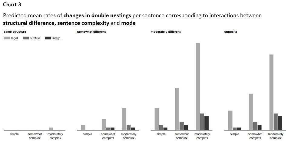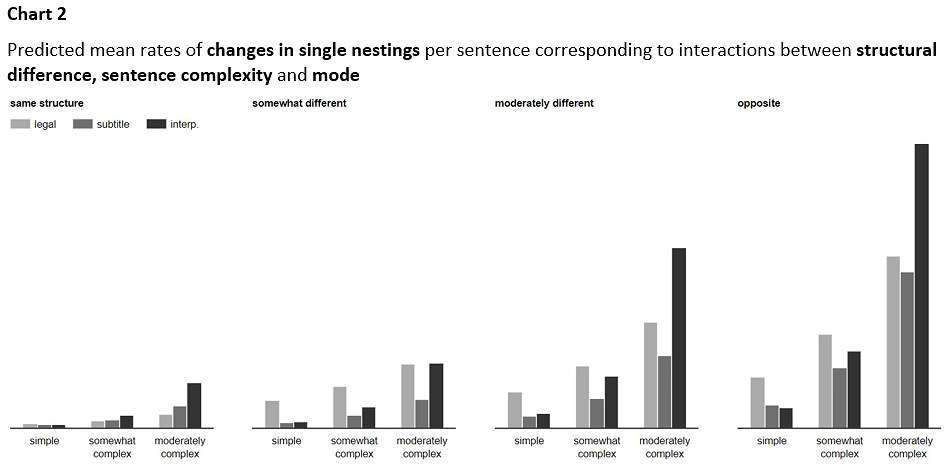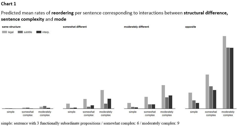 The analysis included three independent variables. The first independent variable was mode of language transfer (legal translation, subtitle translation or simultaneous interpretation). The second independent variable was structural difference of the language pair, referring to differences in the branching direction of subordinate clauses. The third independent variable was sentence complexity, referring to the number of functionally subordinate propositions in the original English version of a sentence. (A functionally subordinate proposition is one which doesn’t make an assertion and can’t be rephrased as an independent sentence.)